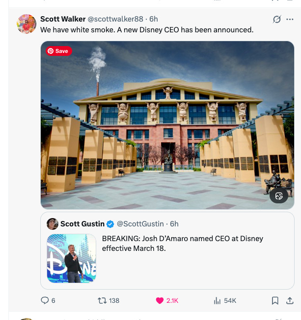 “We have white smoke. A new Disney CEO has been announced,” I read.