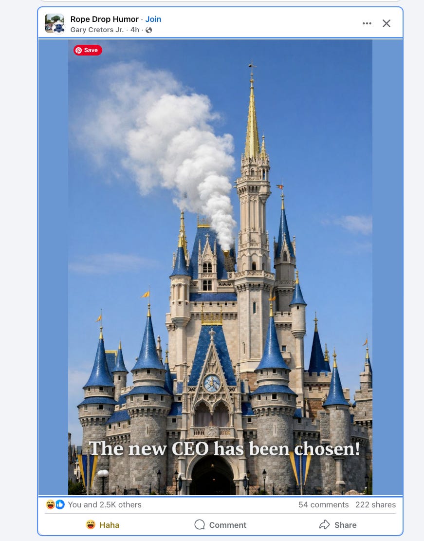 Love this! I’m so interested in the “Disney’s not like other companies” idea. To extend the Pope metaphor, it’s almost like other corporations are Protestant and Disney is Catholic (if the whole religion is capitalism).
